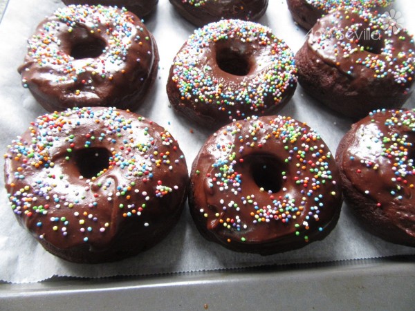 2- Añadir el chocolate,30 seg., vel. 2. Volcar rápidamente en un bol, sumergir la superficie de los donuts y espolvorear adornitos. Hacerlo rápido, que si no, se cristaliza. Dejar unos minutos endurecer.
