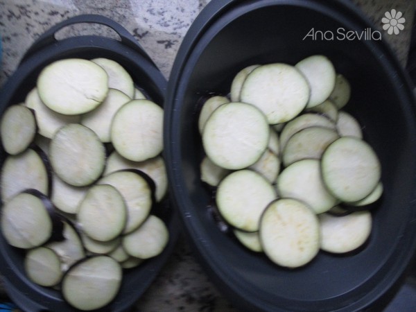 1- Cortar la berenjena con piel en rodajas de 1 cm. Salar bien y repartir por el fondo y bandeja del varoma, Reservar que sude para quitar el amargor.
