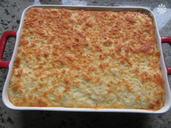 3- Leche, sal, pimienta y nuez moscada, 6 min. 100º, vel.4. Cubrir , espolvorear queso rallado y horno precalentado a 200º, unos 20-25 minutos, hasta que tome color.