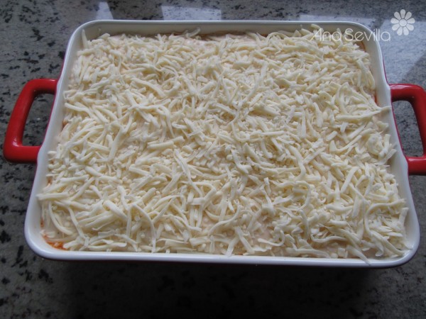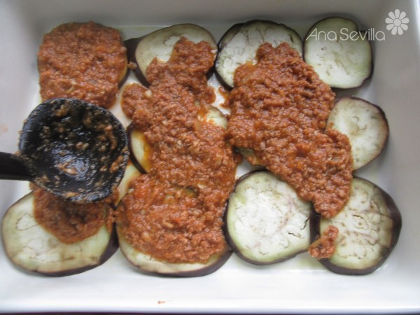 En una fuente engrasada (31x23), colocar capas de berenjena (Secarlas un poco con papel de cocina) y relleno, sucesivamente.