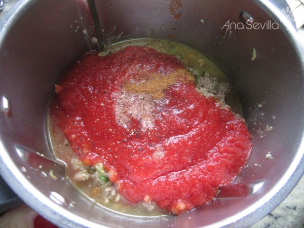 4- Colocar el varoma en su posición. Añadir el tomate nat., sal, pimienta y canela, remover bien, 20 min. Varoma, giro izda., vel. 2.