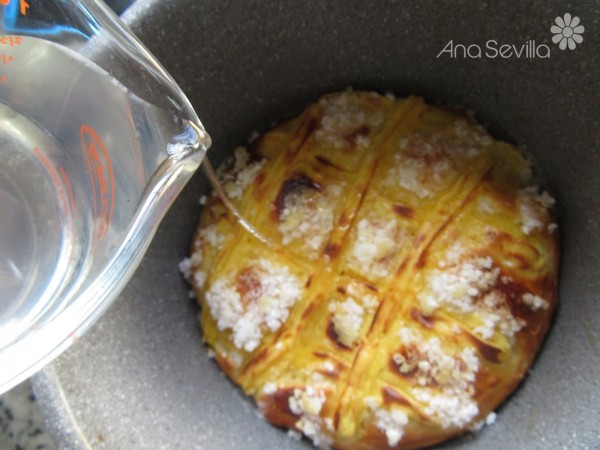 4- Hornear cada bolla, válvula cerrada, menú horno, 10 minutos, 160º. Cancelar menú, volver a programar la olla menú horno, válvula cerrada, 20 minutos a 140º. Sin cancelar menú, poner sobre las cuadrículas un poco de azúcar humedecido con anís y colocar el cabezal a 200º, unos 8-10 minutos. En caliente, pinchar la bolla con una aguja y repartir la mitad del almíbar.