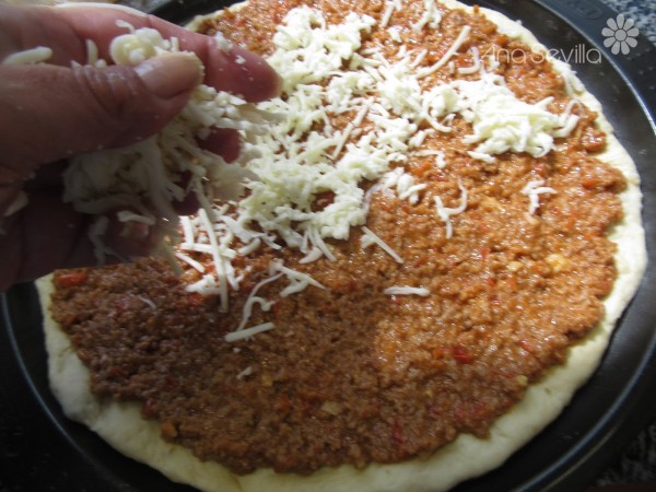 4- Cubrir la base de pizza, espolvorear queso rallado y orégano. Horno precalentado a 250º, al introducir la pizza, bajar a 220º, unos 15 a 18 minutos.