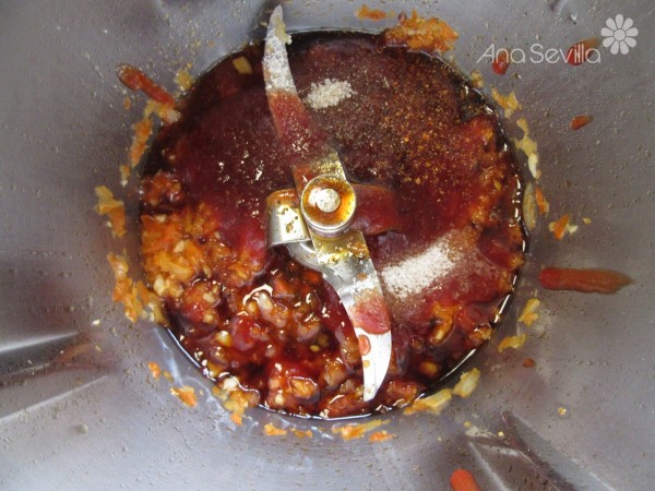2- Añadir la cayena, azúcar, salsa de soja, sal, pimienta y ketchup, 3 min. Varoma, vel.1.