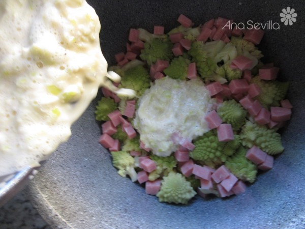 4- Volcar sobre el romanesco, espolvorear queso y simultáneamente el cabezal unos 15 minutos a 200º y olla menú horno, 130º, 10 minutos.