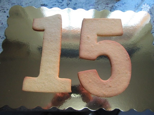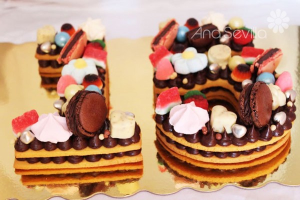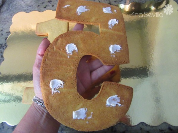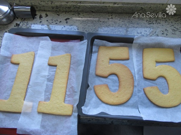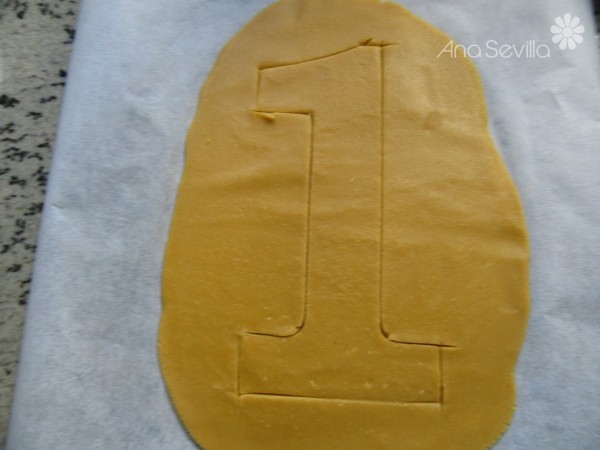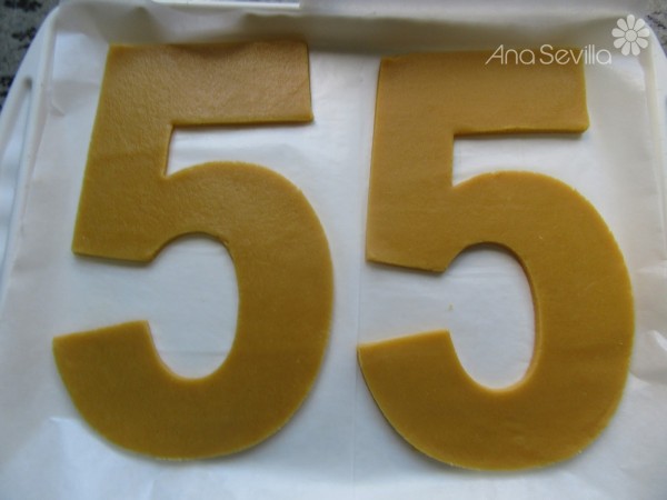 2- Poner la plantilla de número o letra elegido (Éstos son de 25 cm.) y cortar con el filo de un cuchillo afilado. Llevar a la nevera como media hora