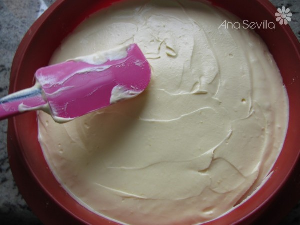 3- Bajar restos hacia las cuchillas, escurrir bien la gelatina, mezclar 6 seg. vel.3 . Dejar templar a temp. ambiente y unir a la nata con mov. envolventes. Volcar sobre la crema de limón, alisar y llevar de nuevo a la nevera unas 4 horas mínimo.
