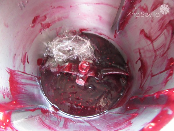 2- Sin lavar el vaso, triturar los frutos rojos con el azúcar, 6 seg., vel. 8. Cocer 18 min., Varoma (120º), vel.4. Sin cubilete, colocar el cestillo en su lugar. Cuando falten 5 minutos, hidratar la gelatina.