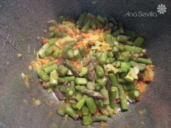 2- Pochar con un poco de aceite el puerro, ajos y zanahoria, hasta que esté blando. Añadir los espárragos, sal y pimienta: Válvula cerrada, menú Turbo, 3 minutos, 130º, alta presión.