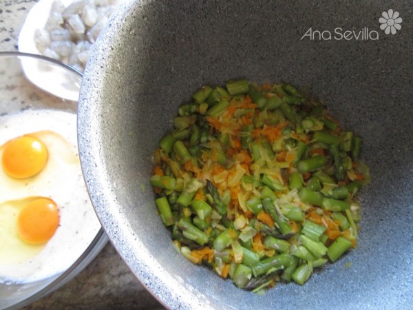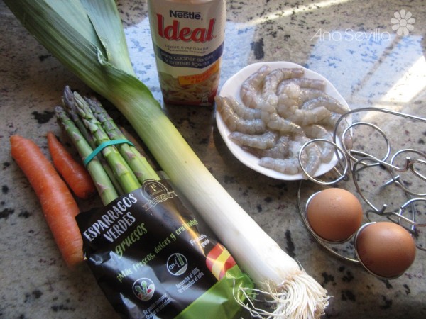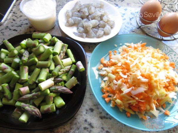 Preparación:1- Cortar los espárragos en trozos, dejando la parte más tierna. Picar el puerro, ajos y zanahoria menudo. Cortar los langostinos crudos en trocitos.