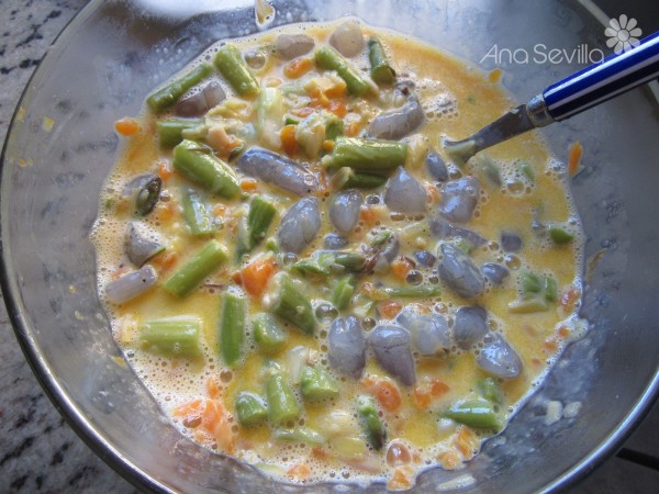 3- Mientras, mezclar la leche ideal o nata, huevos. sal, nuez moscada y pimienta, añadir las verduras y chafar un poco con el tenedor. Agregar los langostinos y remover.
