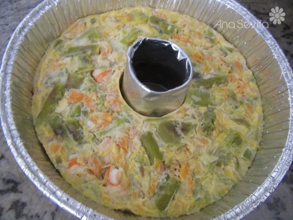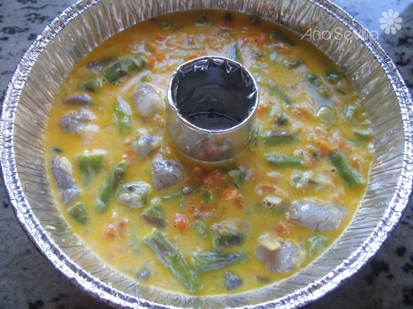 4- Volcar en una flanera engrasada (Yo uso molde desechable de corona tipo Albal), tapar con albal. Introducir la rejilla y 4 vasitos medidores de agua, el molde: Válvula cerrada, menú vapor, 14 minutos, 120º, presión media. (El tiempo , dependerá del tipo de molde). Pinchar con la aguja para comprobar que está bien cuajado.