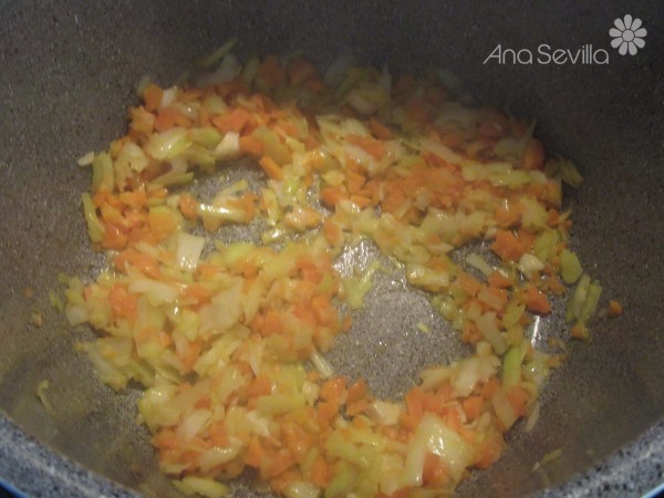2- Pochar con un poco de aceite el puerro, ajos y zanahoria, hasta que esté blando. Añadir los espárragos, sal y pimienta: Válvula cerrada, menú Turbo, 3 minutos, 130º, alta presión.