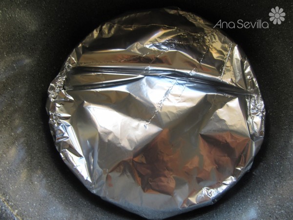 4- Volcar en una flanera engrasada (Yo uso molde desechable de corona tipo Albal), tapar con albal. Introducir la rejilla y 4 vasitos medidores de agua, el molde: Válvula cerrada, menú vapor, 14 minutos, 120º, presión media. (El tiempo , dependerá del tipo de molde). Pinchar con la aguja para comprobar que está bien cuajado.