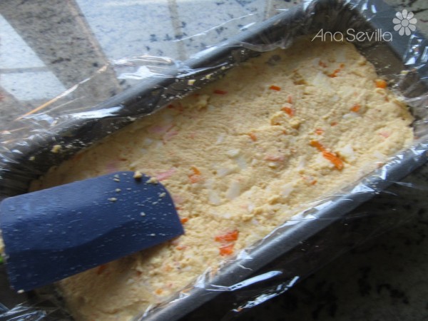 3- Bajar restos tapa y paredes. Agregar el resto de palitos y gambas, mezclar 8 seg., giro izda., vel. 4 y volcar en un molde de plum-cake pequeño (Unos 24 cm.), forrado con film transparente, alisando y apretando bien