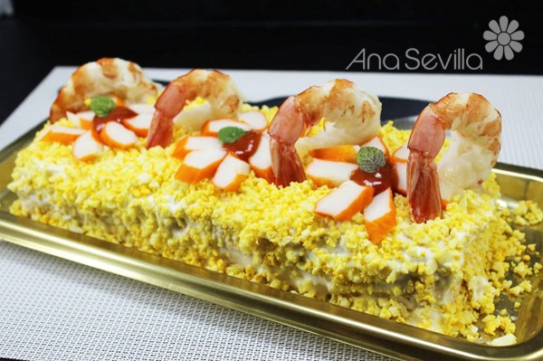 4- Llevar a la nevera unas horas hasta que esté bien frío (3-4 horas). Desmoldar, cubrir con una capita fina de mayonesa y adornar a gustos.