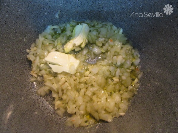 Preparación:1- Picar los cebolla y ajos menudos y pochar con el aceite y mantequilla en menú sofreír unos 6 minutos