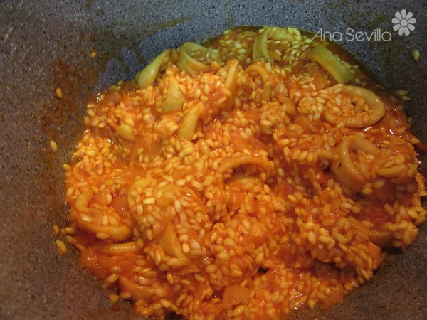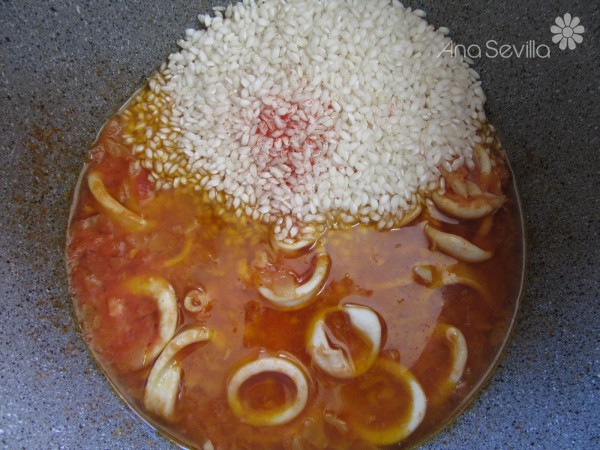 3- Agregar el arroz y azafrán, sofreír un par de minutos.