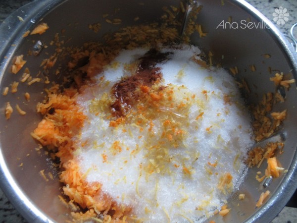 2- Añadir el resto de ingredientes: azúcar, ralladura limón, zumo limón, ralladura naranja, pizco canela en polvo y vainilla y mezclar 10 seg. vel. 5-7-10.