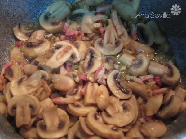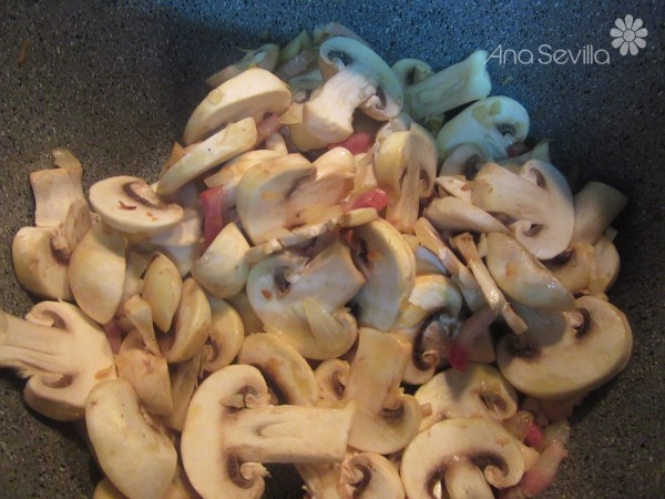 2- Agregar los champiñones , remover: Válvula cerrada, menú turbo, 3 minutos, 140º, alta presión. Comprobar que ha cogido presión, pues la cubeta estará muy caliente.
