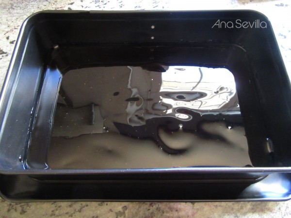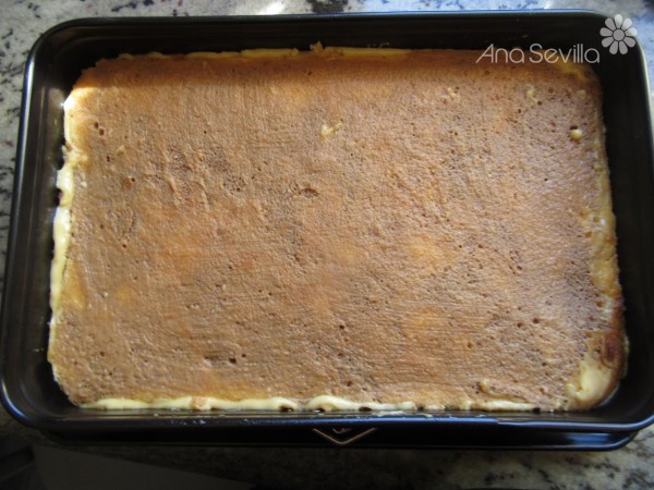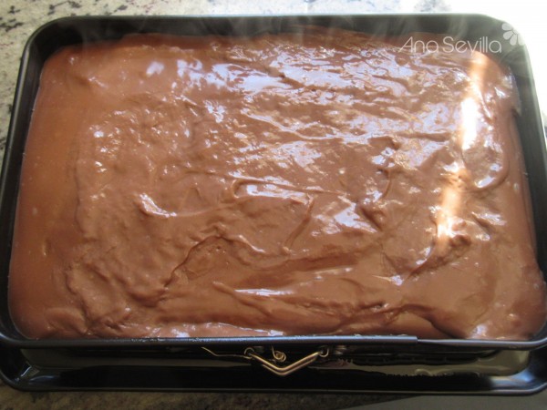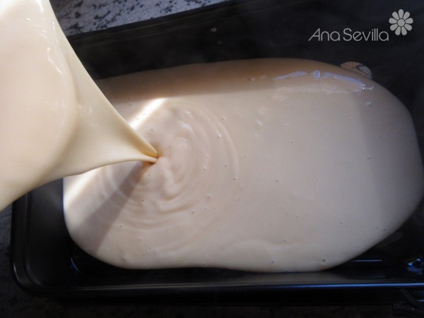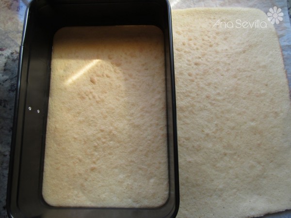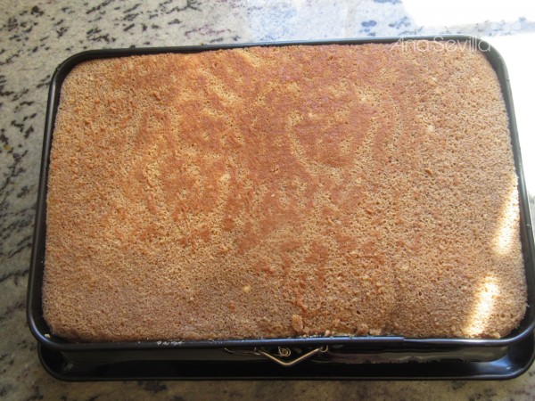 Enfriar y cortar en 2 planchas iguales al molde donde montaremos la tarta. Molde de unos 28x18 cm. (Si es desmontable, que tenga reborde, para que quede ahí el caramelo que sobresalga).