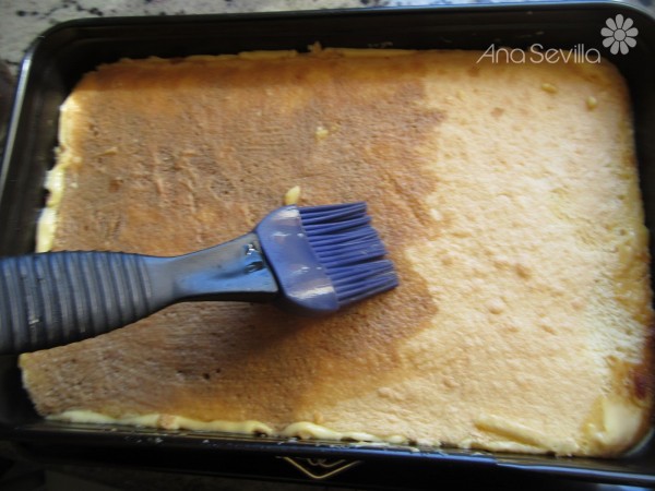 2- Mientras caramelizar el fondo del molde, verter la preparación, cubrir con plancha de bizcocho y pincelar con le mitad del café mezclado con un chorrito de licor.