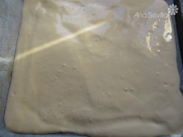 4- Extender sobre la bandeja y hornear (180º) unos 8 -10 minutos, Que quede blanquito. Apagar el horno y abrir la puerta, dejar reposar dentro unos 10 minutos.