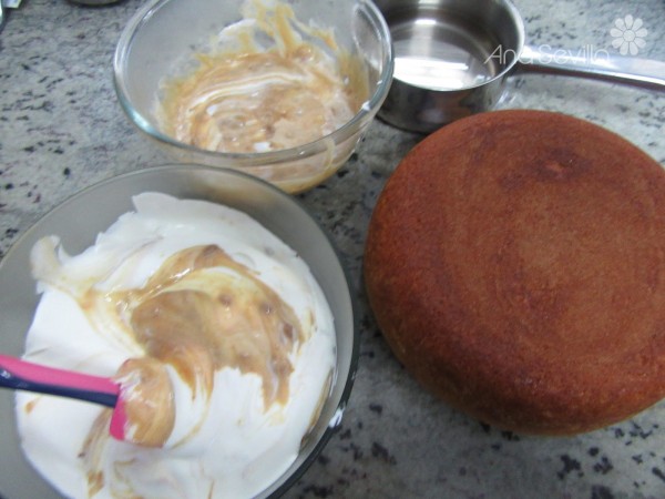 2- Cortar el bizcocho en 3 capas, almibarar , rellenar ,cubrir y adornar con la misma mousse sobrante.