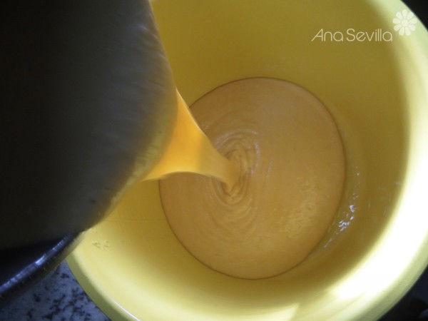 - Tradicional: Con varillas, blanquear los huevos con el azúcar. Añadir la nata, aceite y ralladura y mezclar. Agregar la harina, almendra molida, levadura y sal y mezclar con mov. envolventes hasta que no tenga grumos.