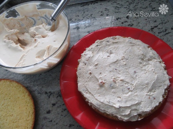2- Cortar el bizcocho en 3 capas, almibarar , rellenar ,cubrir y adornar con la misma mousse sobrante.