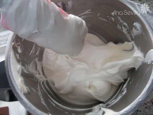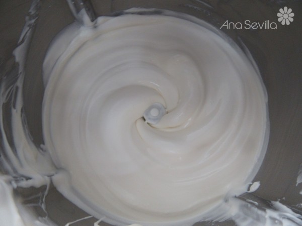 1- Semi-montar la nata con el azúcar glas, unos segundos en vel. 4. No hace falta mariposa. Añadir el mascarpone y vainilla, unos 30 seg., vel. 4. Que al levantar con la lengua queden picos.