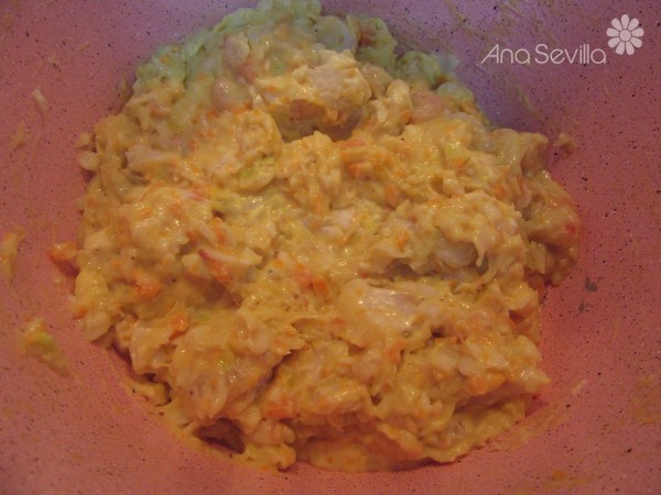 3- Añadir la harina sofreír un par de minutos e ir echando la leche poco a poco hasta que espese, salpimentar y poner un poco de nuez moscada. Desmigar un poco el pescado, y cortar los gambones en trozos, mezclar con las gambas y agregar a la bechamel. Reservar.