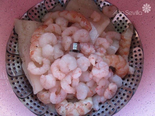 1- Colocar la merluza salpimentada y encima las gambas peladas en una vaporera o cestillo. Un vasito medidor de agua en la cubeta, la vaporera, menú vapor, 3 minutos, 130º, media presión. Reservar.