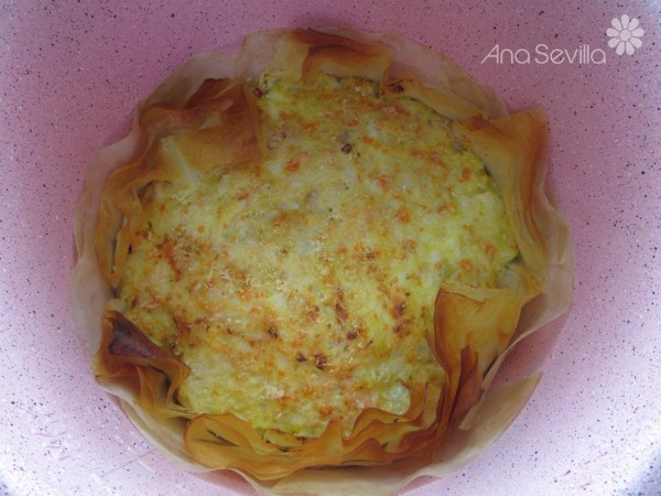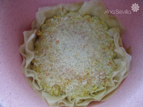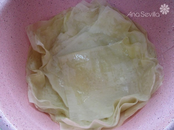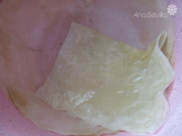 4- Forrar la cubeta con papel hornear. Pincelar cada lámina de pasta filo con mantequilla fundida, cortar por la mitad, superponer y doblar que quede la mantequilla por fuera del papel (Han de quedar 4 capas de cada lámina). Ir colocándolas alrededor como muestran las fotos. Rellenar, espolvorear un poco de queso parmesano rallado.