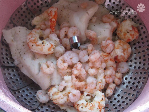 Preparación:1- Colocar la merluza salpimentada y encima las gambas peladas en una vaporera o cestillo. Un vasito medidor de agua en la cubeta, la vaporera, menú vapor, 3 minutos, 130º, media presión. Reservar.
