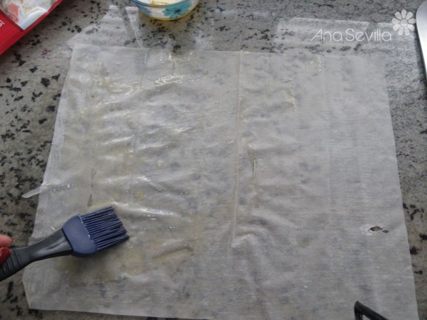 4- Forrar la cubeta con papel hornear. Pincelar cada lámina de pasta filo con mantequilla fundida, cortar por la mitad, superponer y doblar que quede la mantequilla por fuera del papel (Han de quedar 4 capas de cada lámina). Ir colocándolas alrededor como muestran las fotos. Rellenar, espolvorear un poco de queso parmesano rallado.