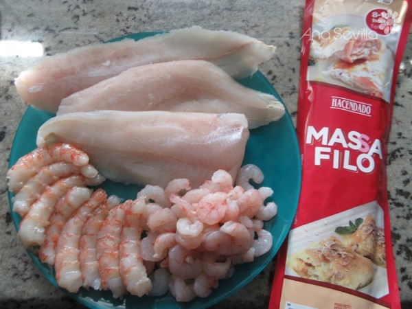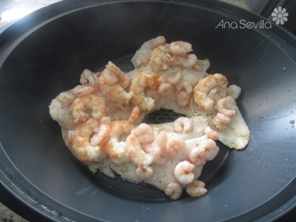 1- Colocar la merluza salpimentada y encima las gambas peladas, en el fondo del varoma. Reservar.