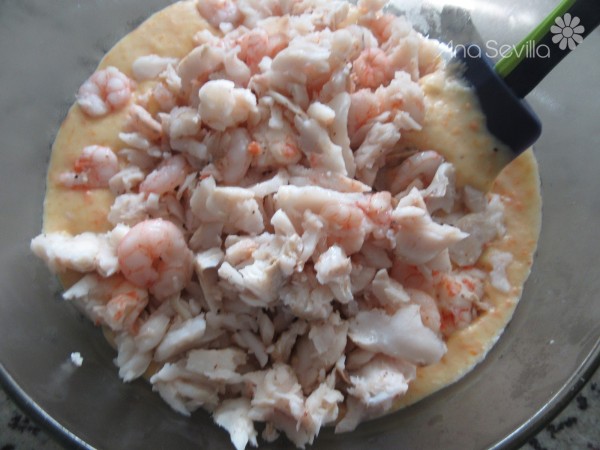 3- Retirar el varoma, sofreír la harina, 3 min. 100º, giro izda., vel. 3. Mientras, desmigar un poco el pescado, y cortar los gambones en trozos, mezclar con las gambas. Reservar.