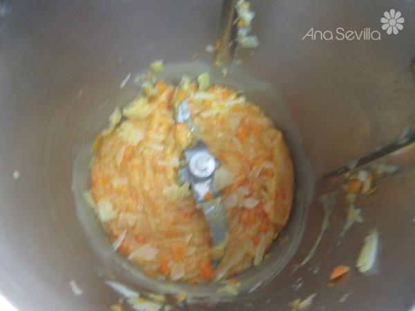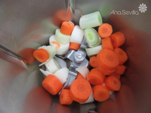 2- Picar la zanahoria y puerro, 5 seg vel.4. Bajar restos hacia las cuchillas, añadir el aceite y mantequilla. Colocar el varoma en su posición. 15 min. Varoma, giro izda, vel.2.