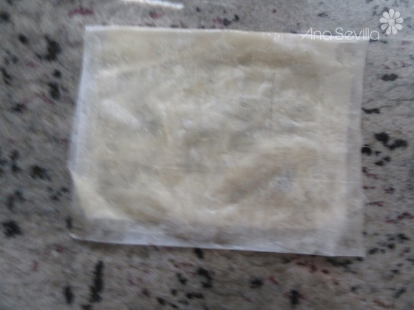 5- Pincelar cada lámina de pasta filo con mantequilla fundida, cortar por la mitad, superponer y doblar que quede la mantequilla en contacto con el molde. (Han de quedar 4 capas de cada lámina). Introducir en moldecitos o flaneras individuales engrasadas. Rellenar, espolvorear un poco de queso parmesano rallado.