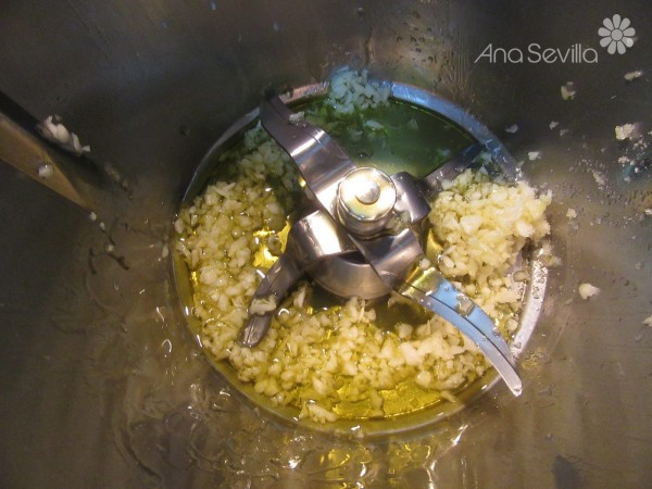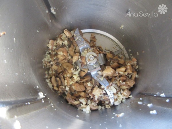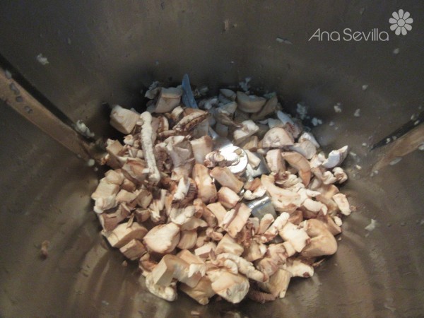 2- Picar los ajos, 4 seg. ve.5. Bajar restos hacia las cuchillas añadir 20 gr. aceite, 3 min., Varoma, vel. cuchara. Agregar los pies de champiñones troceados, 3 min., Varoma, giro izda., vel. cuchara.