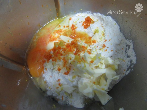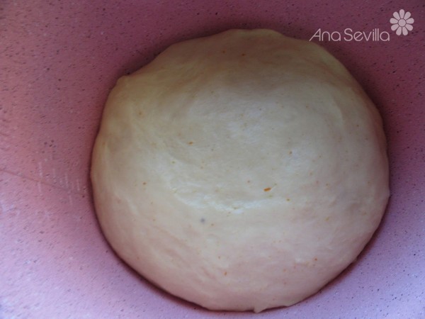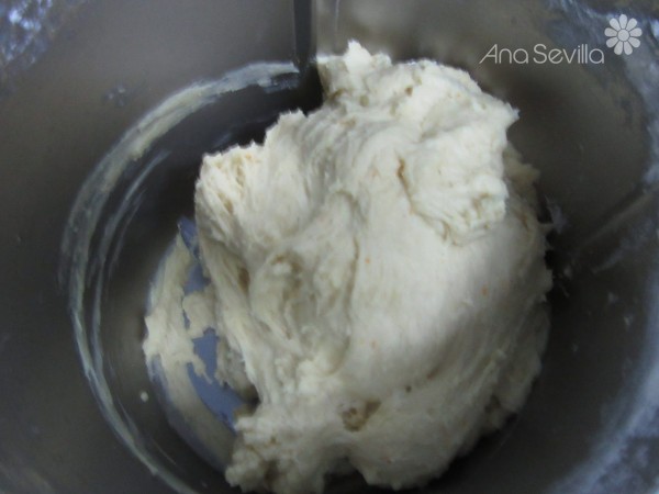 2- Agregar la harina, huevo, miel o azúcar invertido, mantequilla en trocitos, sal, azahar o vainilla y ralladuras, 4 min., Espiga. Dejar levar e un bol amplio engrasado como 2 horas tapado en un lugar cálido hasta que doble su volumen.