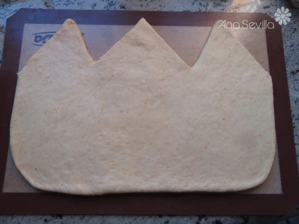 3- Estirar la masa en forma de rectángulo, recortar los picos y la tira de abajo, pegar la tira con yema de huevo. (Me sobró una bolita de masa de los picos de la corona). Tapar como 30-60 minutos, a que leve un poco. Pincelar el resto con la yema sobrante y poner adornos.