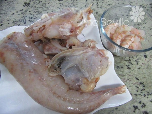Ana SevillaPues cuezo la espina, cabeza de rape y las cáscaras y pieles de los langostinos o gambas, unos 15 minutos, lo cuelas y listo. Si quieres puedes ponerle un trozo de puerro al cocerlo todo.