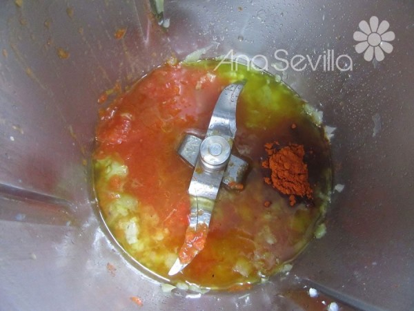 3- Salsa de tomate, vino blanco y pimentón, 5 min., 100º, vel. cuchara, sin cubilete para favorecer la evaporación del alcohol.