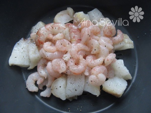 1- Colocar el rape salpimentado y las gambas en el fondo del varoma. Reservar.