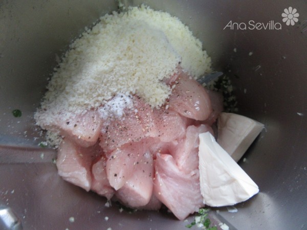 3- Ajos y perejil, 4 seg. vel.5. Añadir la pechuga troceada, 1 cta. sal, pimienta, quesitos y 60 gr. del queso rallado, 20 seg., vel.5.
