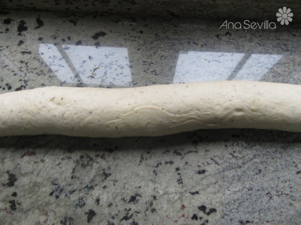 6- Desgasificar sobre la mesa de trabajo. (Quitar el aire amasando un poco). Dejar unos minutos para que la masa se relaje y nos sea más fácil estirarla.