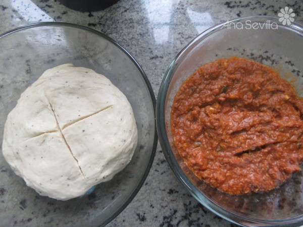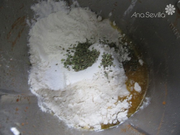 5- Harina, sal y 1 cta. de orégano, 4 min. vel. Espiga. Echar en un bol engrasado, tapar y dejar levar hasta que doble volumen en un lugar cálido. (En olla GM, 50 minutos, válvula cerrada, menú fermentar).
