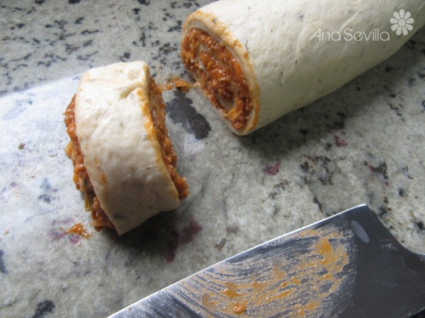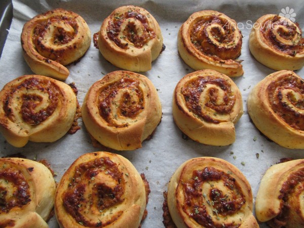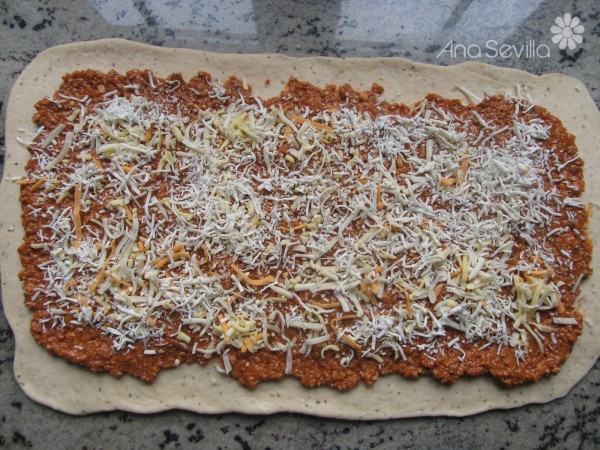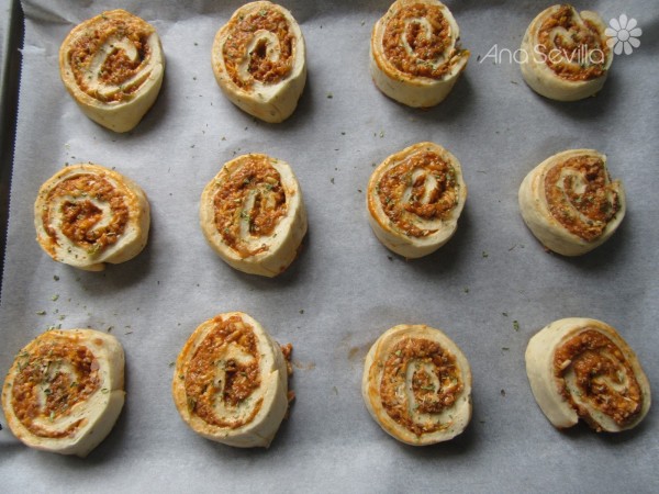 7- Extender el relleno, espolvorear queso rallado. Enrollar con cuidado apretando un poco el relleno para que no se salga. Cortar con un cuchillo bien afilado, para que no se deformen, en discos de unos 3 cm, de grosor. Ir colocándolos en una bandeja separados entre sí. Sale una bandeja y media. Espolvorear con un poquito de orégano por encima. Tapar con un paño, mientras se precalienta el horno 20 minutos a 220º.